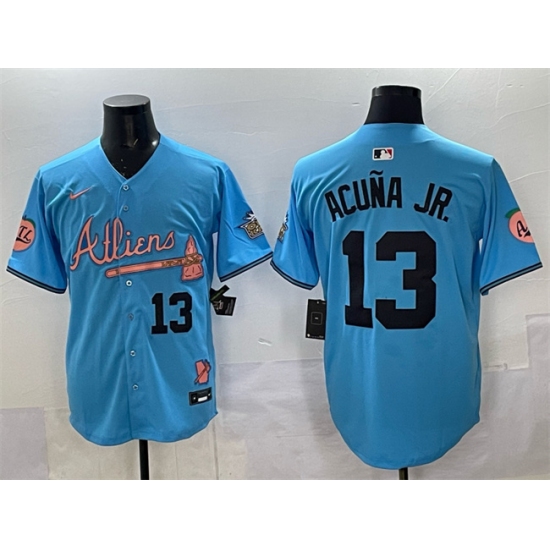 >Men's Atlanta Braves #13 Ronald Acuna Jr. Blue 2024 Atliens & Peach With Outkast Vapor Limited Stitched Baseball Jersey