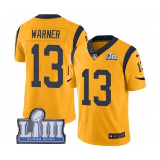 >Men's Nike Los Angeles Rams #13 Kurt Warner Limited Gold Rush Vapor Untouchable Super Bowl LIII Bound NFL Jersey