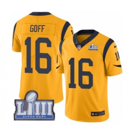 >Men's Nike Los Angeles Rams #16 Jared Goff Limited Gold Rush Vapor Untouchable Super Bowl LIII Bound NFL Jersey