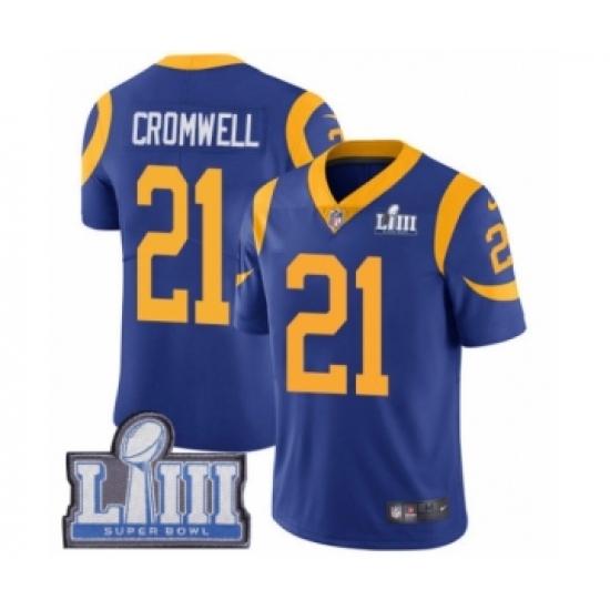 >Men's Nike Los Angeles Rams #21 Nolan Cromwell Royal Blue Alternate Vapor Untouchable Limited Player Super Bowl LIII Bound NFL Jersey