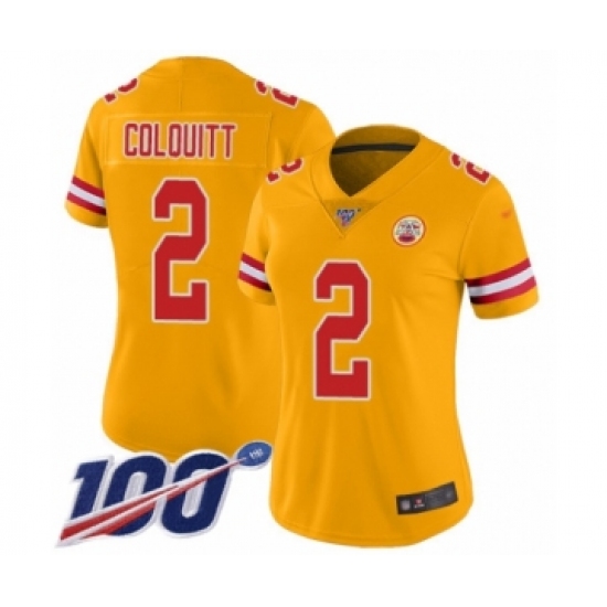 >Women's Kansas City Chiefs #2 Dustin Colquitt Limited Gold Inverted Legend 100th Season Football Jersey