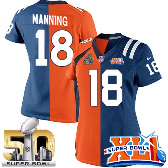 Home>NFL>Indianapolis Colts>Peyton Manning>Women's Nike Indianapolis Colts #18 Peyton Manning Elite Royal Blue/Orange Split Fashion Super Bowl XLI & Super Bowl L NFL Jersey