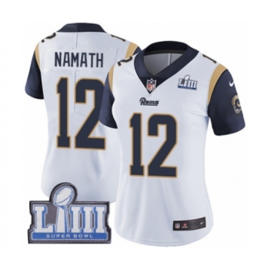 Women's Nike Los Angeles Rams #12 Joe Namath White Vapor Untouchable Limited Player Super Bowl LIII Bound NFL Jersey