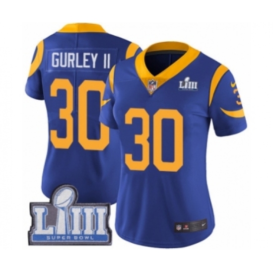>Women's Nike Los Angeles Rams #30 Todd Gurley Royal Blue Alternate Vapor Untouchable Limited Player Super Bowl LIII Bound NFL Jersey