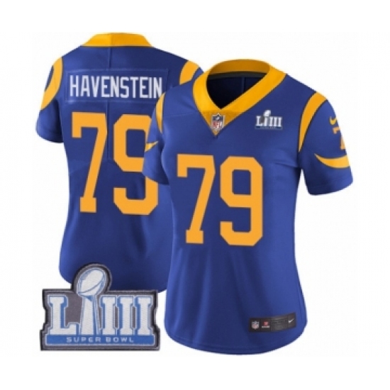 >Women's Nike Los Angeles Rams #79 Rob Havenstein Royal Blue Alternate Vapor Untouchable Limited Player Super Bowl LIII Bound NFL Jersey