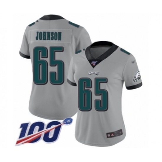 >Women's Philadelphia Eagles #65 Lane Johnson Limited Silver Inverted Legend 100th Season Football Jersey