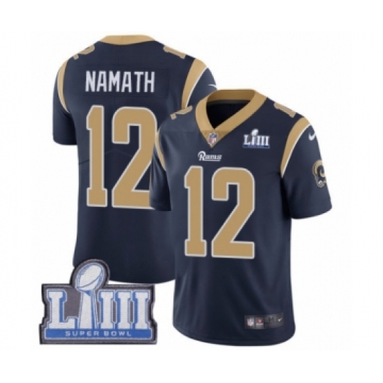 >Youth Nike Los Angeles Rams #12 Joe Namath Navy Blue Team Color Vapor Untouchable Limited Player Super Bowl LIII Bound NFL Jersey