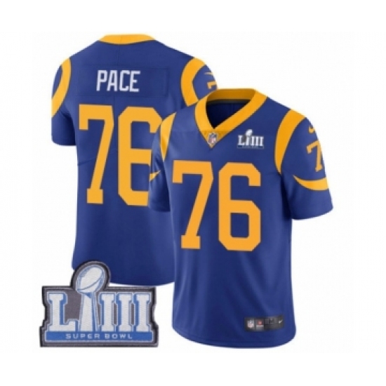 >Youth Nike Los Angeles Rams #76 Orlando Pace Royal Blue Alternate Vapor Untouchable Limited Player Super Bowl LIII Bound NFL Jersey