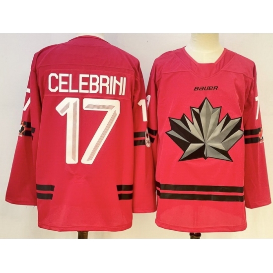 >Men's Canada Hockey #17 Macklin Celebrini Red Stitched Jersey