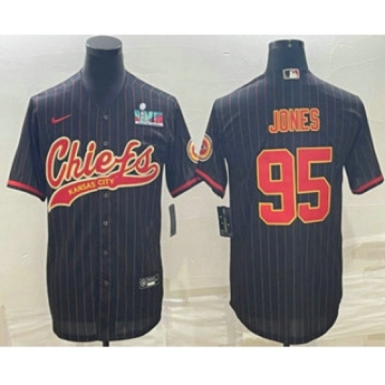 Men's Kansas City Chiefs #95 Chris Jones Black Pinstripe With Super Bowl LVII Patch Cool Base Stitched Baseball Jersey