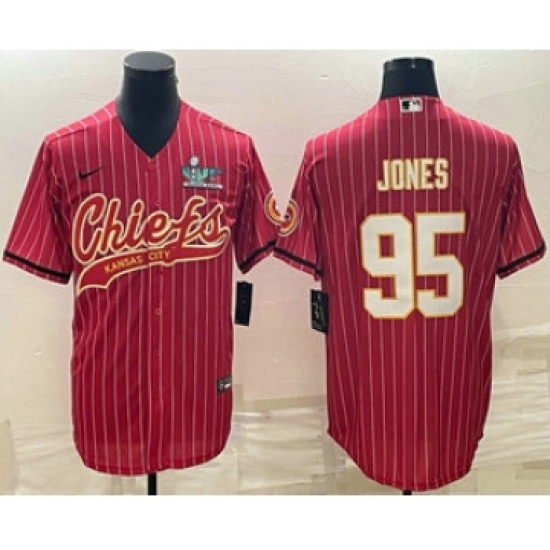 Men's Kansas City Chiefs #95 Chris Jones Red Pinstripe With Super Bowl LVII Patch Cool Base Stitched Baseball Jersey