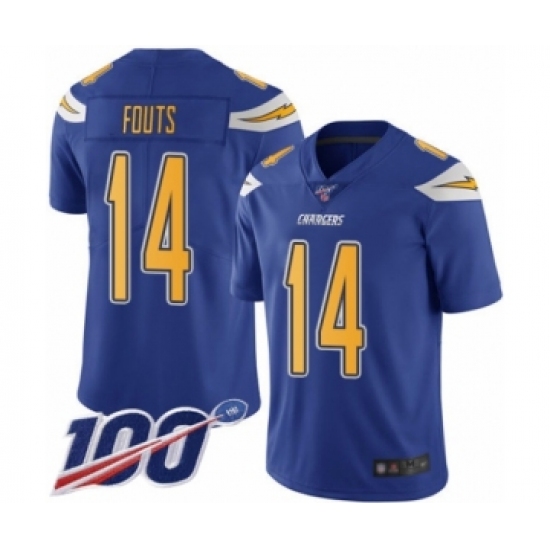 >Men's Los Angeles Chargers #14 Dan Fouts Limited Electric Blue Rush Vapor Untouchable 100th Season Football Jersey