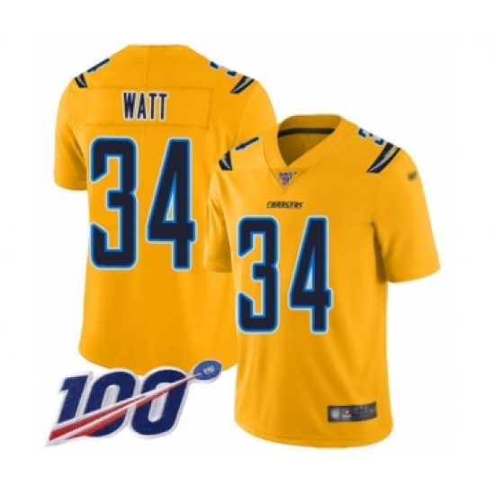 >Men's Los Angeles Chargers #34 Derek Watt Limited Gold Inverted Legend 100th Season Football Jersey