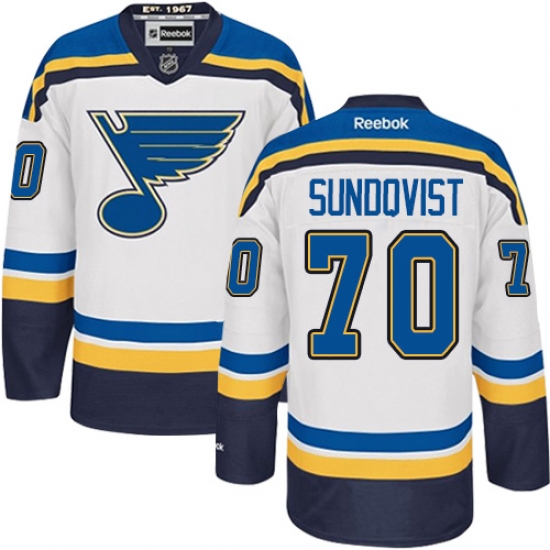 Home>NHL>St. Louis Blues>Oskar Sundqvist>Men's Reebok St. Louis Blues #70 Oskar Sundqvist Authentic White Away NHL Jersey