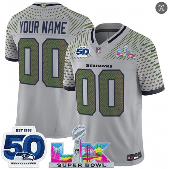 Men's Seattle Seahawks Active Player Custom Gray 2025 F.U.S.E. Super Bowl LX Patch And 50th Season Patch “Rivalries” Vapor Limited Stitched Jersey