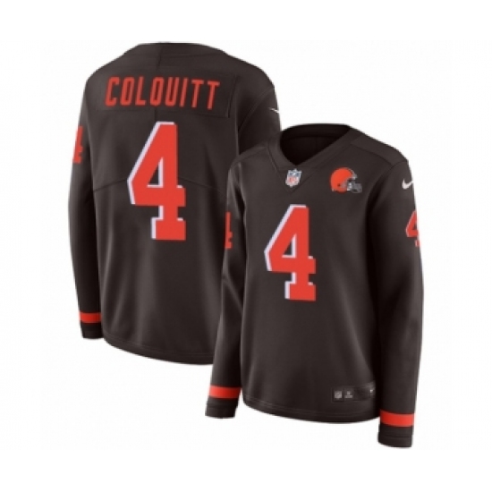>Women's Nike Cleveland Browns #4 Britton Colquitt Limited Brown Therma Long Sleeve NFL Jersey