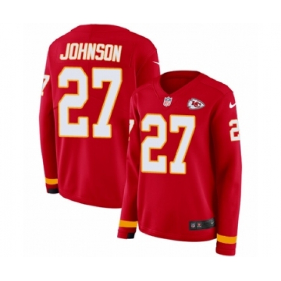 >Women's Nike Kansas City Chiefs #27 Larry Johnson Limited Red Therma Long Sleeve NFL Jersey