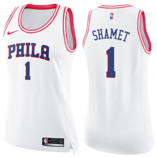 >Women's Nike Philadelphia 76ers #1 Landry Shamet Swingman White Pink Fashion NBA Jersey