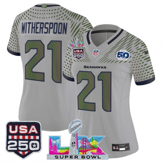 Women's Seattle Seahawks #21 Devon Witherspoon Gray 2025 F.U.S.E. Super Bowl LX & US 250th anniversary And 50th Season“Rivalries” Vapor Limited Football St