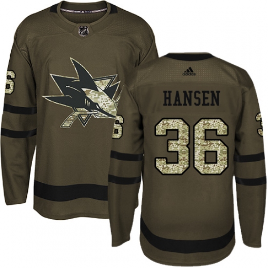 Home>NHL>San Jose Sharks>Jannik Hansen>Youth Adidas San Jose Sharks #36 Jannik Hansen Premier Green Salute to Service NHL Jersey