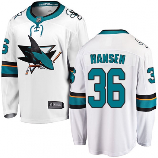 Home>NHL>San Jose Sharks>Jannik Hansen>Youth San Jose Sharks #36 Jannik Hansen Fanatics Branded White Away Breakaway NHL Jersey