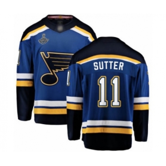 >Youth St. Louis Blues #11 Brian Sutter Fanatics Branded Royal Blue Home Breakaway 2019 Stanley Cup Champions Hockey Jersey